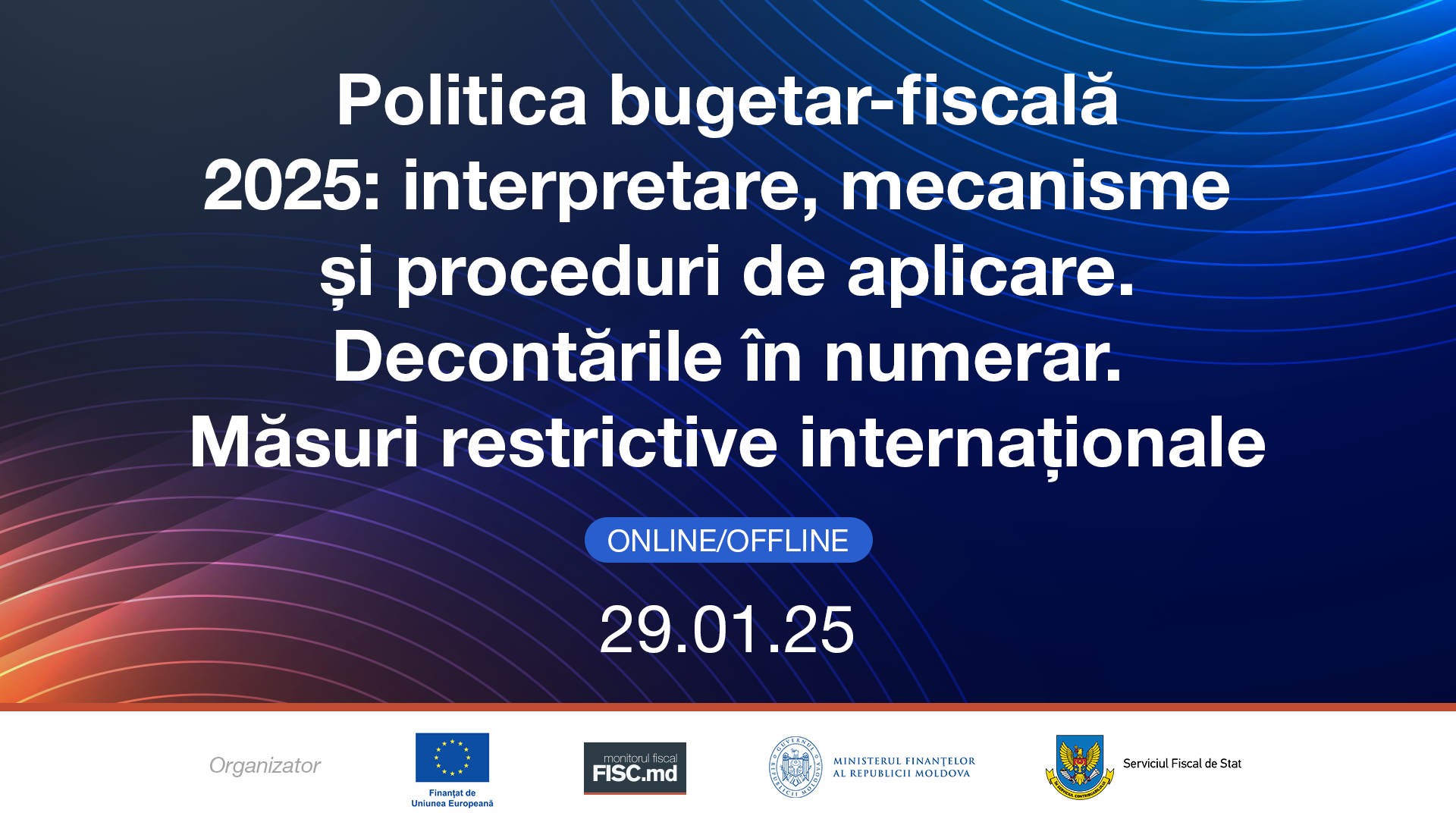 Ministerul Finanțelor, împreună cu Misiunea Înalților Consilieri ai Uniunii Europene, P.P. „Monitorul Fiscal FISC.md” și Serviciul Fiscal de Stat, organizează la 29 ianuarie 2025, evenimentul: „Politica bugetar-fiscală 2025: interpretare, mecanisme și proceduri de aplicare. Decontările în numerar: Măsuri restrictive internaționale”.