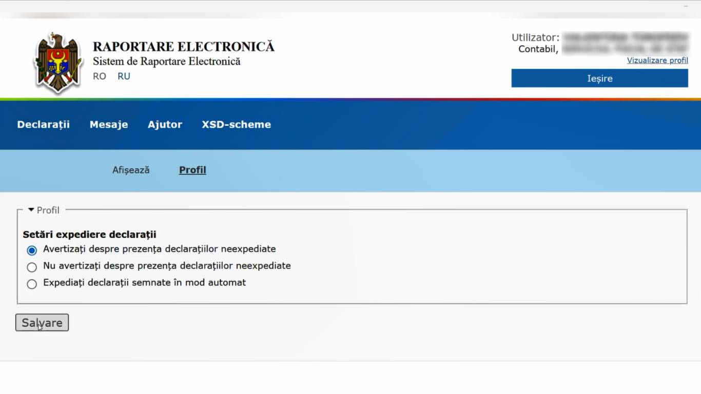 Pentru a gestiona tipurile de notificare se va accesa profilul personal cu aplicarea setărilor după necesitate. Poate fi setată avertizarea despre prezența declarațiilor neexpediate sau expedierea în mod automatizat a declarațiilor semnate. La fel, poate fi dezactivată notificarea.