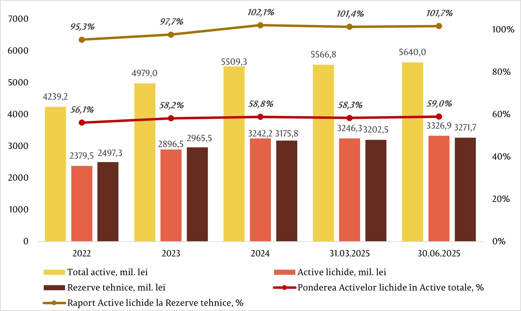 Activele totale ale societăților de asigurare au înregistrat la 30.06.2025 o valoare de 5 640,0 milioane lei, în creștere cu 73,2 milioane lei sau 1,3 la sută față de 31.03.2025. Valoarea activelor lichide a constituit 3 326,9 milioane lei, în creștere cu 2,5 la sută față de situația din 31.03.2025, ceea ce reprezintă 59,0 la sută din activele totale înregistrate de către societățile de asigurare. Valoarea activelor lichide raportată la valoarea rezervelor tehnice totale pe piață a fost de 101,7 la sută.