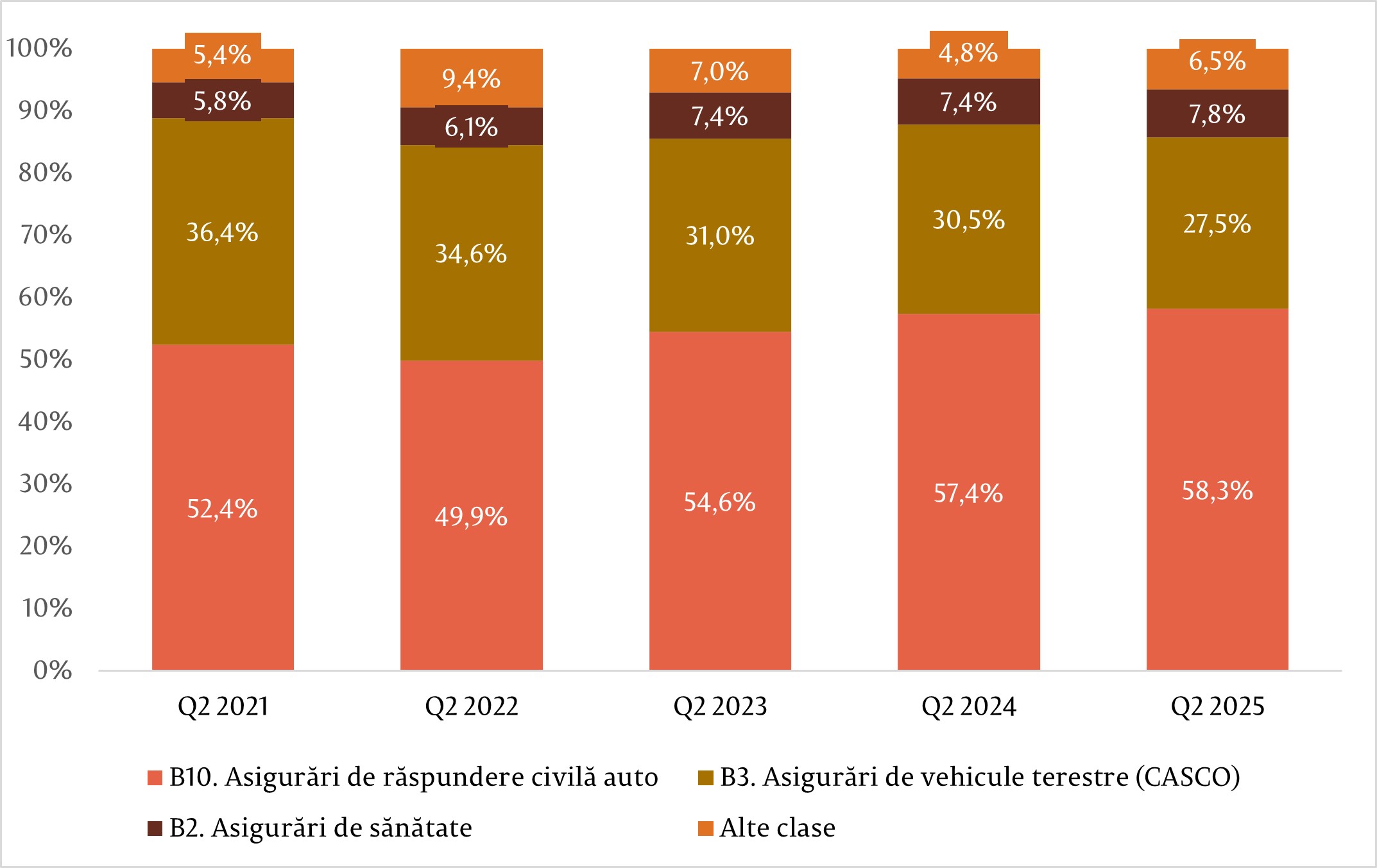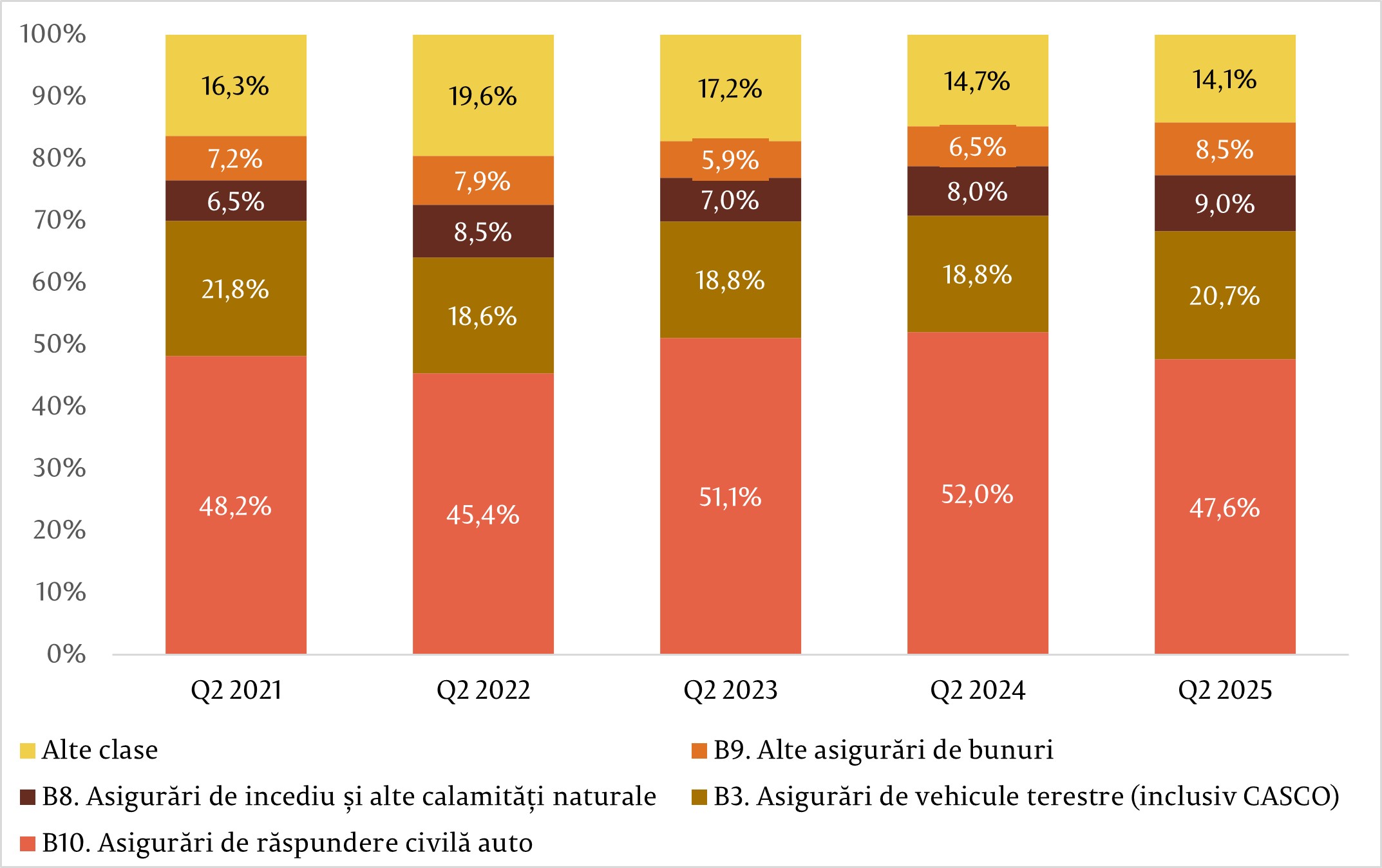 Astfel, din totalul primelor brute subscrise pentru asigurările generale, cele mai mari ponderi le-au deținut Asigurările obligatorii de răspundere civilă auto (RCA internă, Carte Verde, Carnet TIR, Carnet CMR) și Asigurările de vehicule terestre, altele decât cele feroviare (CASCO), cumulând peste 68,4 la sută din piață, urmate de Asigurările de incendiu și alte calamități naturale, pentru care au fost subscrise 9,0 la sută din prime și Alte asigurări de bunuri (preponderent – asigurarea culturilor agricole) cu o cotă 8,5 la sută din prime. Celelalte clase de asigurări cumulează prime brute subscrise mai puțin de 82 milioane lei sau 5,4 la sută.