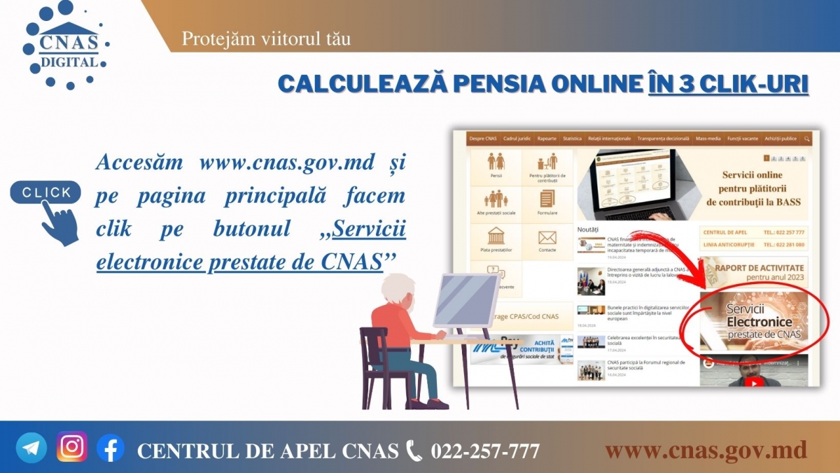 Casa Națională de Asigurări Sociale reamintește tuturor cetățenilor că pagina oficială a autorității www.cnas.gov.md reprezintă nu doar o sursă sigură și comodă de informație, dar și o platformă de accesare a serviciilor publice electronice. Astfel, îndemnăm cetățenii să utilizeze serviciul „Calculator pensie” pentru a afla mărimea estimată a viitoarei pensii pentru limită de vârstă.