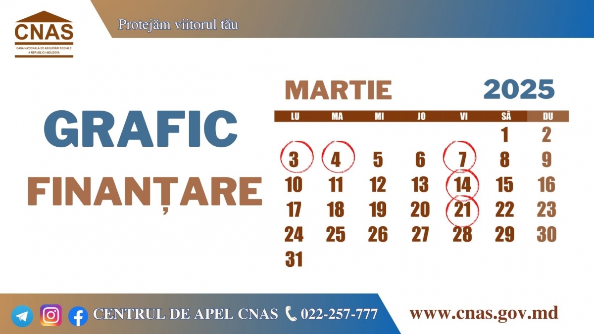 Transferul pentru indemnizațiile unice la nașterea copilului, indemnizațiile pentru creșterea copiilor, indemnizațiile pentru creșterea copiilor gemeni și indemnizațiile paternale vor fi finanțate în zilele de 3, 7, 14 și 21 martie. Indemnizațiile pentru incapacitate temporară de muncă și indemnizațiile de maternitate vor fi finanțate în data de 7, 14 și 21 martie.