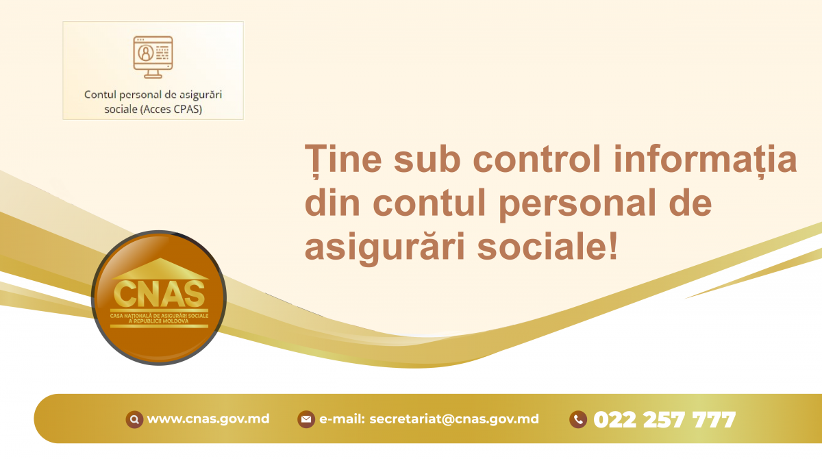Casa Națională de Asigurări Sociale reamintește că, serviciul electronic "Acces CPAS" de pe pagina oficială www.cnas.gov.md este opțiunea ce permite oricărei persoane asigurate să monitorizeze online starea contului personal de asigurări sociale, adică a accesa și vizualiza datele despre achitarea contribuţiilor de asigurări sociale declarate de angajator pentru perioada de după 1 ianuarie 1999, precum și poți urmări formarea viitoarei pensii.