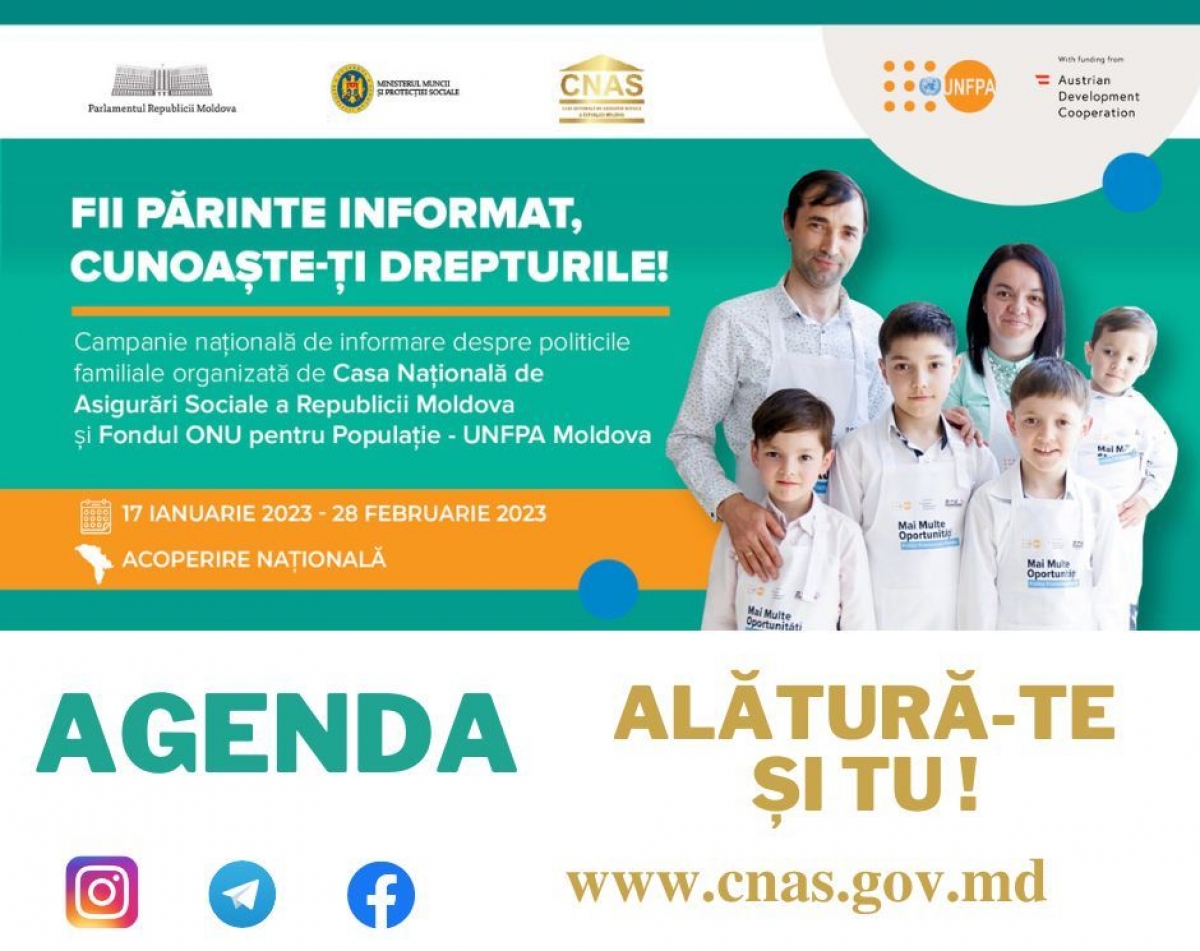 Casa Națională de Asigurări Sociale amintește, că și săptămâna curentă în raioanele țării vor fi organizate evenimentele de informare preconizate în cadrul Campaniei naționale de informare "Fii părinte informat, cunoaște-ți drepturile!", desfășurate de CNAS în parteneriat cu Fondul Națiunilor Unite pentru Populație (UNFPA Moldova), în coordonare cu Parlamentul Republicii Moldova, Ministerul Muncii și Protecției Sociale și cu suportul Cancelariei de Stat.