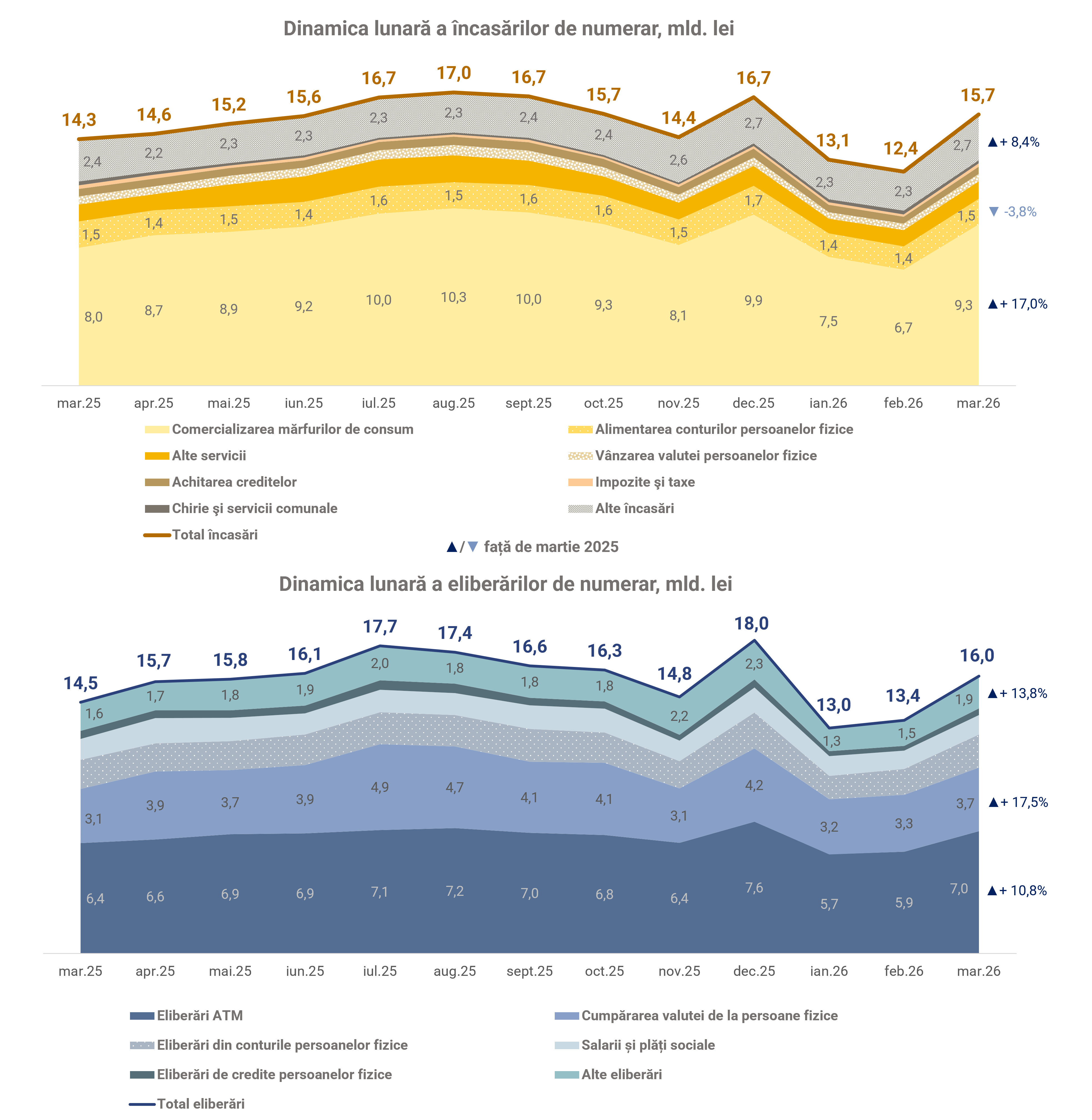 În martie 2026, volumul eliberărilor de numerar din casele băncilor a depășit cu 275 milioane lei volumul încasărilor de numerar în casele acestora1. În luna de referință, volumul încasărilor de numerar a fost de 15 705 milioane lei, majorându-se cu 1 427 milioane lei (+10,0 la sută) față de luna s