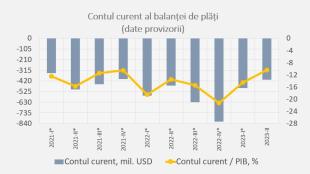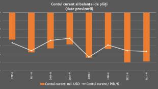 Conform datelor preliminare, în trimestrul II 2025, deficitul contului curent al balanței de plăți a Republicii Moldova a totalizat -1 005,91 mil. USD, majorându-se cu 41,6 la sută comparativ cu perioada similară a anului 2024, pe seama creșterii substanțiale a deficitului comerțului exterior cu bu
