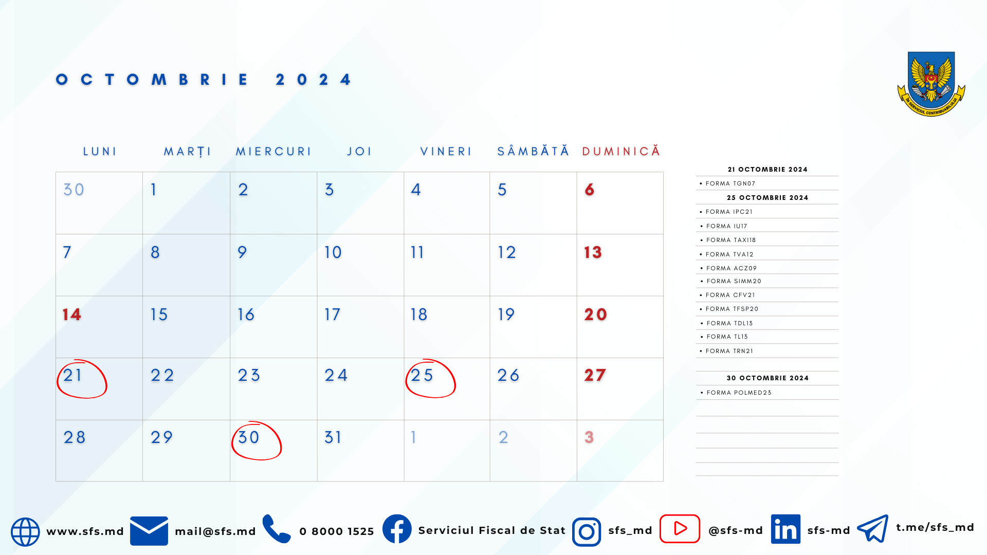 Serviciul Fiscal de Stat informează despre faptul că, termenul limită de prezentare a dărilor de seamă fiscale și termenul de achitare a impozitelor, taxelor, primelor de asigurare obligatorie de asistență medicală și a contribuțiilor de asigurări sociale pentru luna august este data de 25 octombrie 2024.