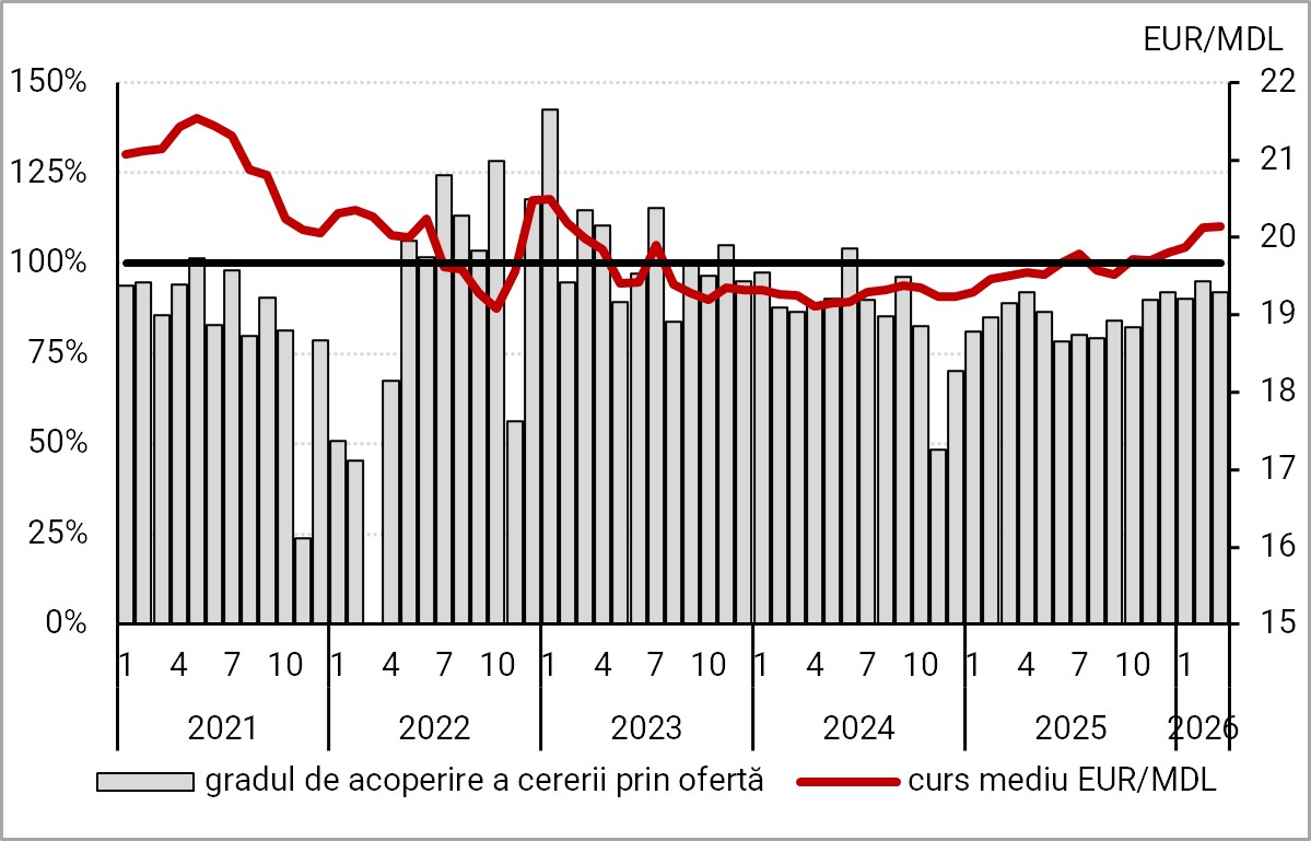 În luna martie 2026, gradul de acoperire a cererii nete de valută din partea agenților economici prin oferta netă de valută de la persoanele fizice1 a constituit 92,0% comparativ cu 95,0% în luna februarie 2026.