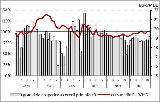 În luna noiembrie 2025, gradul de acoperire a cererii nete de valută din partea agenților economici prin oferta netă de valută de la persoanele fizice1 a constituit 89,9% comparativ cu 82,1% în luna octombrie 2025.