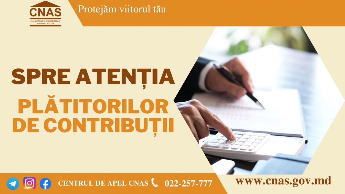 Pentru a fi la curent cu noutăți din domeniul reglementărilor destinate plătitorilor de contribuții la BASS vă sugerăm să urmăriți noutățile pe pagina web-oficială www.cnas.gov.md, dar și postările noastre pe Facebook, Instagram și Telegram.