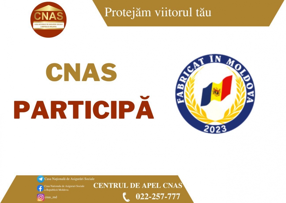 Casa Națională de Asigurări Sociale anunță despre participarea la cea de-a XX-a ediție a Expoziției naționale „Fabricat în Moldova", care se va desfășura în perioada 1-5 februarie 2023, la CIE „Moldexpo", în pavilionul central şi în pavilionul nr.2, în care se va afla echipa specialiştilor din cadrul Casei Naţionale de Asigurări Sociale.