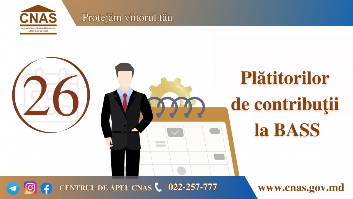 Casa Națională de Asigurări Sociale reamintește, că data de 26 mai 2025 reprezintă termenul limită de declarare şi de plată a contribuțiilor de asigurări sociale de stat obligatorii la bugetul asigurăril