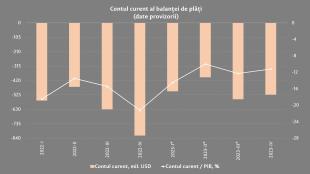 Conform datelor preliminare, în anul 2023, deficitul contului curent al Republicii Moldova s-a contractat comparativ cu cel înregistrat în anul 2022, atât ca valoare absolută, cât și raportat la PIB. În valoare absolută, deficitul a constituit 1 973,65 mil. USD, cu 20,5 la sută mai puțin comparativ cu anul 2022, iar în trimestrul IV 2023, acesta a totalizat 522,87 mil. USD, în scădere cu 36,3 la sută față de același trimestru al anului precedent. Raportat la PIB, deficitul contului curent a constituit 11,9 la sută în anul 2023 și 11,2 la sută în trimestrul IV 2023. Soldul contului curent a fost determinat, în special, de scăderea deficitului balanței comerciale.