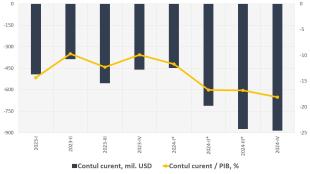 Conform datelor preliminare, în anul 2024, deficitul contului curent al balanței de plăți a Republicii Moldova a totalizat 2 917,00 mil. USD și s-a majorat cu 54,1 la sută față de anul 2023, pe seama creșterii deficitului balanței comerciale cu bunuri și de diminuările excedentelor veniturilor primare și secundare, în timp ce excedentul balanței serviciilor s-a majorat nesemnificativ. De menționat că în trimestrul IV 2024, deficitul contului curent a fost de -884,27 mil. USD, în creștere cu 92,5 la sută comparativ cu perioada similară a anului precedent. Raportul dintre deficitul contului curent înregistrat în anul 2024 și PIB a fost de 16,0 la sută, cu 4,7 p.p. mai mare față de cel consemnat anul 2023 (în trimestrul IV 2024 acesta a fost de 18,1 la sută sau cu 8,2 p.p. mai mare comparativ cu perioada similară a anului precedent).