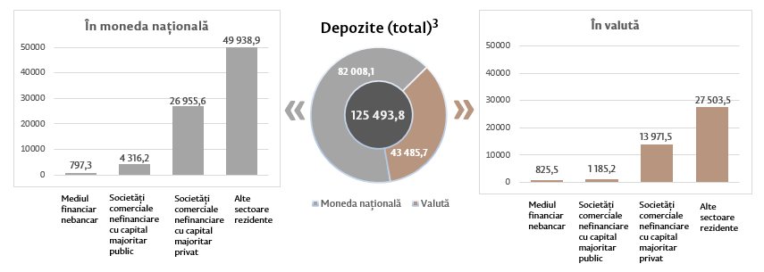 Soldul depozitelor în moneda națională s-a majorat cu 2 800,0 milioane lei comparativ cu luna precedentă și a constituit 82 008,1 milioane lei, reprezentând o pondere de 65,3 la sută în soldul total al depozitelor. Totodată, soldul depozitelor în valută (recalculat în lei) s-a majorat cu 1 025,6 milioane lei comparativ cu luna precedentă, până la nivelul de 43 485,7 milioane lei, având o pondere de 34,7 la sută (diagrama 3).