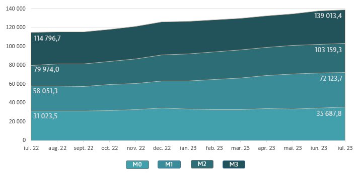 În luna iulie 2023, baza monetară1 s-a majorat cu 2 537,8 milioane lei (+3,3 la sută) față de luna precedentă și a constituit 79 950,0 milioane lei, fiind cu 21,7 la sută mai mare față de perioada similară a anului precedent. Masa monetară M02 (Bani în circulație) s-a majorat cu 1 384,7 milioane le