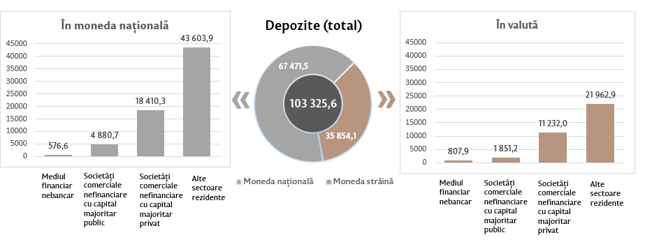 Soldul depozitelor în moneda națională s-a diminuat cu 550,0 milioane lei comparativ cu luna precedentă și a constituit 67 471,5 milioane lei, reprezentând o pondere de 65,3 la sută din soldul total al depozitelor. Totodată, soldul depozitelor în valută (recalculat în lei) s-a majorat cu 89,2 milioane lei comparativ cu luna precedentă, până la nivelul de 35 854,1 milioane lei, având o pondere de 34,7 la sută (diagrama 3).