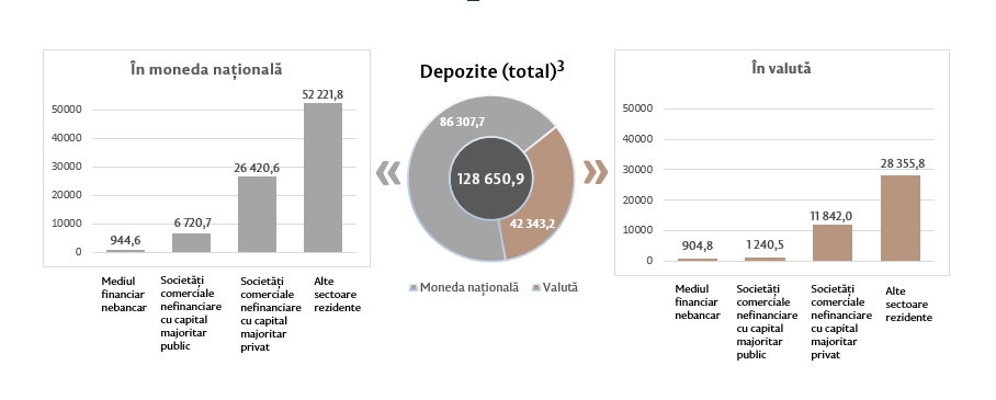 Soldul depozitelor în moneda națională s-a majorat cu 946,4 milioane lei comparativ cu luna precedentă și a constituit 86 307,7 milioane lei, reprezentând o pondere de 67,1 la sută în soldul total al depozitelor. Totodată, soldul depozitelor în valută (recalculat în lei) s-a micșorat cu 188,4 milioane lei comparativ cu luna precedentă, până la nivelul de 42 343,2 milioane lei, având o pondere de 32,9 la sută (diagrama 3).