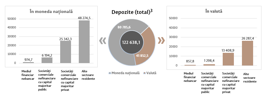 Soldul depozitelor în moneda națională s-a majorat cu 1 091,5 milioane lei comparativ cu luna precedentă și a constituit 80 785,6 milioane lei, reprezentând o pondere de 65,9 la sută în soldul total al depozitelor. Totodată, soldul depozitelor în valută (recalculat în lei) s-a majorat cu 439,8 milioane lei comparativ cu luna precedentă, până la nivelul de 41 852,5 milioane lei, având o pondere de 34,1 la sută (diagrama 3).