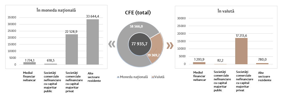 Soldul cererilor față de economie8 (diagrama 4) a constituit 77 935,7 milioane lei, majorându-se în luna octombrie 2024 comparativ cu luna septembrie 2024 cu 1 546,0 milioane lei (+2,0 la sută), ca urmare a creșterii cererilor față de economie în moneda națională cu 1 221,9 milioane lei (+2,1 la sută) și a creșterii cererilor față de economie în valută (exprimate în MDL) cu 324,1 milioane lei (+1,7 la sută).