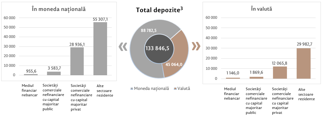 Soldul depozitelor în moneda națională a constituit 88 782,5 milioane lei, în creștere cu 454,1 milioane lei comparativ cu luna precedentă, reprezentând o pondere de 66,3 la sută în soldul total al depozitelor. Totodată, soldul depozitelor în valută (recalculat în lei) a constituit 45 064,0 milioane lei, micșorându-se cu 21,8 milioane lei comparativ cu luna precedentă, având o pondere de 33,7 la sută (diagrama 3).