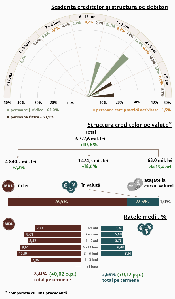 Rata medie la creditele de consum acordate în moneda națională s-a majorat cu 0,09 p.p. și a constituit 10,62 la sută. Rata medie la creditele imobiliare acordate în moneda națională s-a diminuat cu 0,06 p.p., constituind 6,98 la sută.