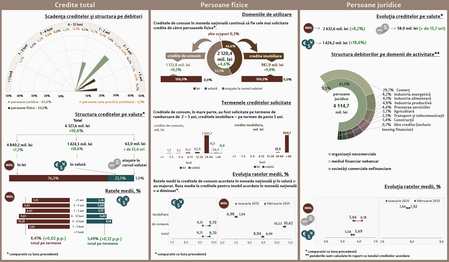 Persoanele fizice în luna februarie 2025 au contractat credite în volum de 2 120,4 milioane lei (Infografic 2), în creștere cu 4,6 la sută față de luna precedentă, partea majoră (53,1 la sută) fiind acordată pentru consum. Majoritatea creditelor de consum acordate persoanelor fizice (1 001,7 milioane lei) au fost acordate în moneda națională pe termene de la 2 până la 5 ani.