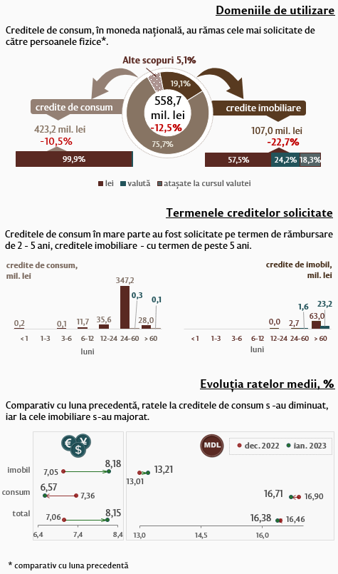 Persoanele fizice în luna ianuarie 2023 au contractat creditele (Infografic 2) în volum de 558,7 milioane lei (-12,5 la sută comparativ cu luna precedentă), partea majoră (75,7 la sută) fiind acordată pentru consum. Majoritatea acestor credite (347,2 milioane lei) au fost acordate în moneda națională pe termene de la 2 până la 5 ani.