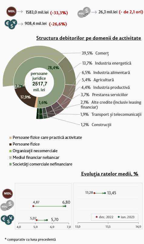 Partea majoră (78,4 la sută) a creditelor noi acordate a fost contractată de către societățile comerciale nefinanciare.