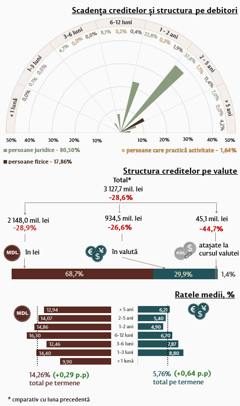 Rata medie nominală la creditele noi acordate în moneda națională s-a majorat cu 0,29 puncte procentuale comparativ cu luna precedentă și a constituit 14,26 la sută, rata medie la cele în valută s-a majorat cu 0,64 puncte procentuale, constituind 5,76 la sută.