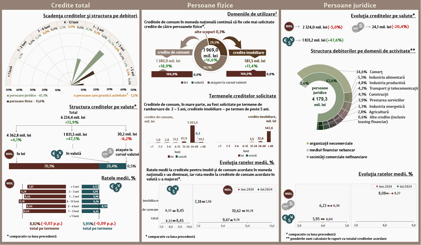 În luna iulie 2024, creditele noi1 acordate (Infografic 1) au constituit 6 224,4 milioane lei, în creștere cu 13,9 la sută față de luna iunie 2024. Partea majoră (70,1 la sută) reprezintă creditele în moneda națională, care au constituit 4 362,8 milioane lei, în creștere cu 4,1 la sută față de luna precedentă.
