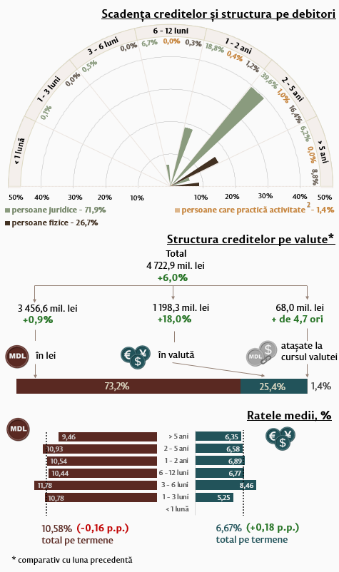 Rata medie nominală la creditele noi acordate în moneda națională s-a micșorat cu 0,16 puncte procentuale comparativ cu luna precedentă și a constituit 10,58 la sută, rata medie la cele în valută s-a majorat cu 0,18 puncte procentuale, constituind 6,67 la sută.