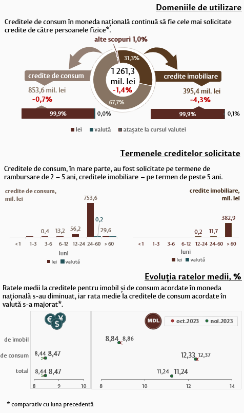 Persoanele fizice în luna noiembrie 2023 au contractat credite (Infografic 2) în volum de 1 261,3 milioane lei, în descreștere cu 1,4 la sută comparativ cu luna precedentă, partea majoră (67,7 la sută) fiind acordată pentru consum. Majoritatea acestor credite (753,6 milioane lei) au fost acordate în moneda națională pe termene de la 2 până la 5 ani.