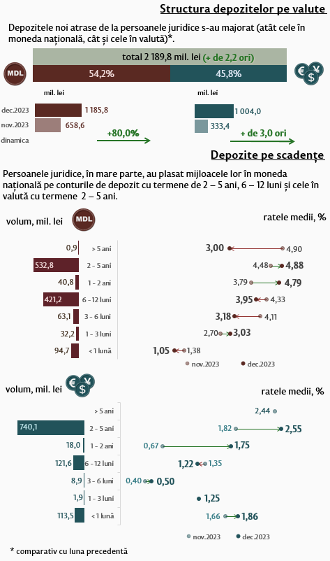 Rata medie la creditele acordate persoanelor juridice în moneda națională s-a micșorat cu 0,22 puncte procentuale, până la nivelul de 10,14 la sută. În același timp, rata medie la creditele acordate în valută s-a majorat cu 0,19 puncte procentuale și a constituit 6,67 la sută.