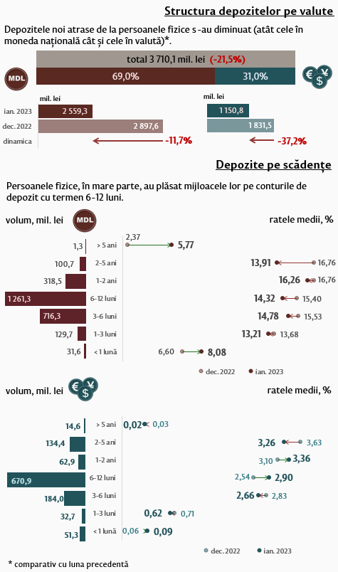 Depozitele persoanelor fizice în luna ianuarie 2023 au constituit 3 710,1 milioane lei (-21,5 la sută comparativ cu luna precedentă).