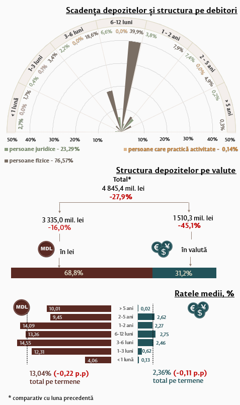 Rata medie nominală la depozite noi atrase în moneda națională s-a diminuat cu -0,22 puncte procentuale comparativ cu luna precedentă și a constituit 13,04 la sută. Rata medie nominală la depozitele în valută s-a diminuat cu -0,10 puncte procentuale constituind 2,36 la sută.