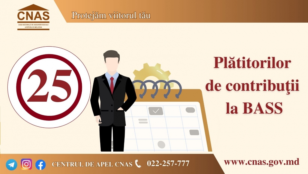 Casa Naţională de Asigurări Sociale reaminteşte, că data de 25 iulie 2024 reprezintă termenul limită de declarare şi de plată a contribuţiilor de asigurări sociale de stat obligatorii la bugetul asigurăr