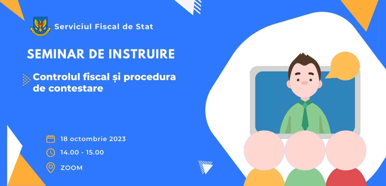 Serviciul Fiscal de Stat continuă organizarea seminarelor de instruire pentru contribuabili. Astfel, la data de 18 octombrie 2023, ora 14:00, va fi organizată o sesiune aferent controlului fiscal și procedurii de contestare, în contextul aprobării noului Regulamentul cu privire la e