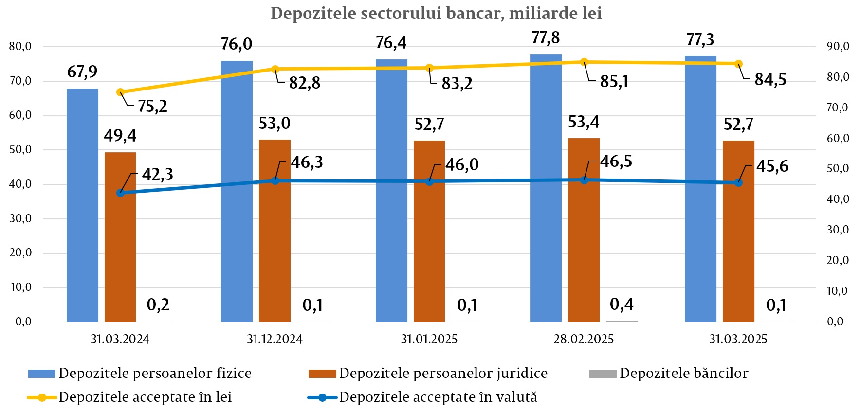 În trimestrul I 2025, soldul total al depozitelor s-a majorat cu 1 049,5 milioane lei sau cu 0,8%, constituind 130 141,3 milioane lei (depozitele persoanelor fizice au constituit 59,4% din totalul depozitelor, depozitele persoanelor juridice – 40,5% și depozitele băncilor – 0,1%), ca urmare a creșterii soldului depozitelor persoanelor fizice cu 1 360,5 milioane lei (1,8%), până la 77 318,9 milioane lei și a descreșterii soldului depozitelor persoanelor juridice cu 296,8 milioane lei (0,6%), până la 52 715,2 milioane lei.