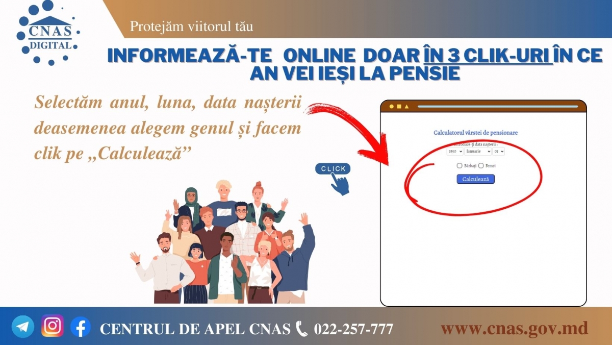 Casa Națională de Asigurări Sociale reamintește tuturor cetățenilor despre serviciul electronic „Calculatorul vârstei de pensionare”, disponibil pe site-ul oficial al instituției (www.cnas.md), la
