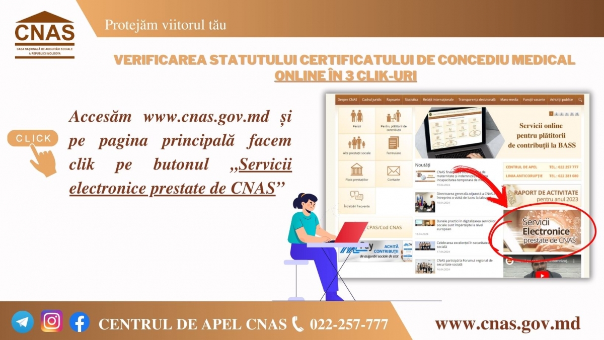 Casa Națională de Asigurări Sociale amintește tuturor cetățenilor despre posibilitatea de a verifica online statutul certificatului medical. Pentru a utiliza acest serviciu electronic urmează să int